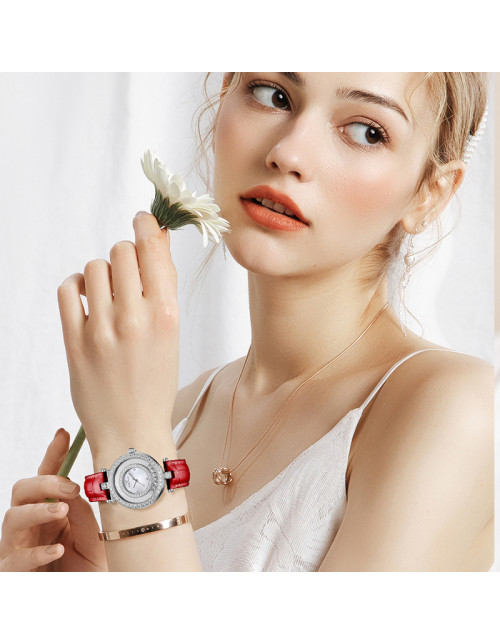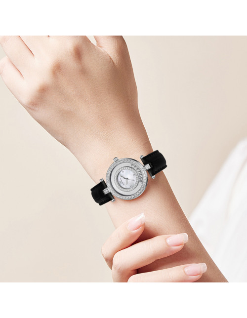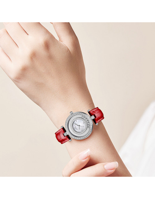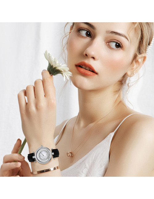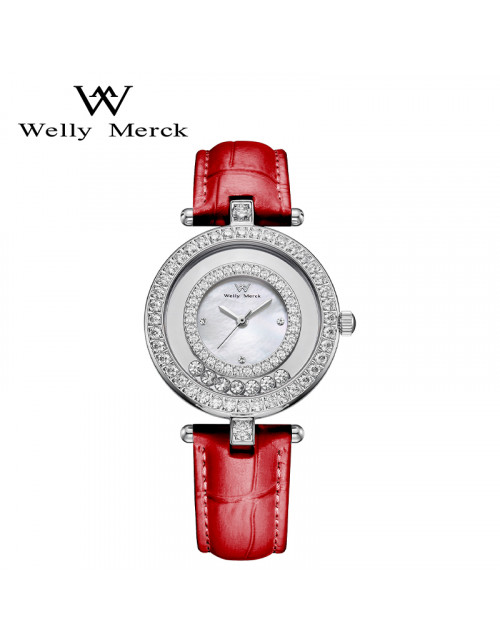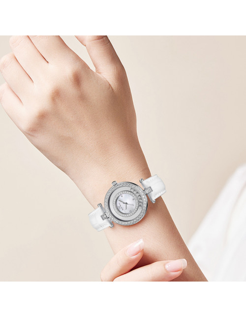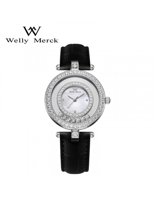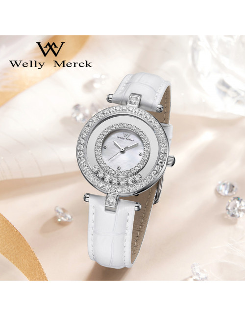 WellyMerck - 白色皮革鑲鑽圓形女士腕錶